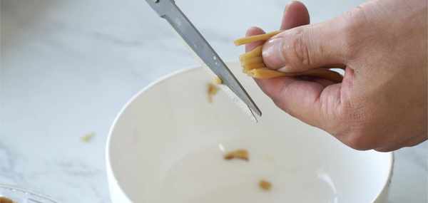 然後把擠幹的黃花菜頭用剪刀剪掉,不然頭部比較老吃起來影響口感不好吃。