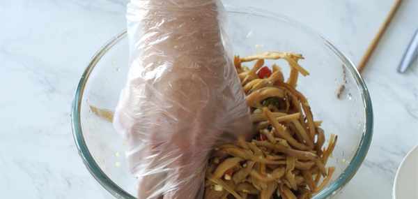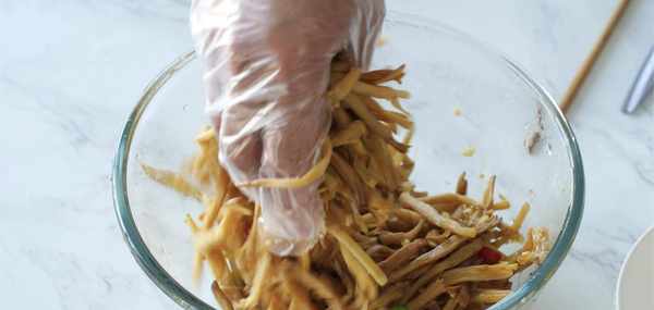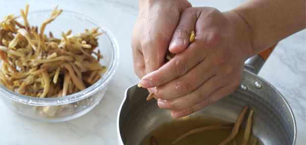 我們煮熟後需要把黃花菜用手擠壓出水分,因為水分太多瞭吃起來就沒有黃花菜的口感好,因為纖維和水分會影響它的口感,盡量擠幹一些!