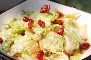 5.大火放入瀝幹水分的包菜、幹辣椒繼續翻炒。