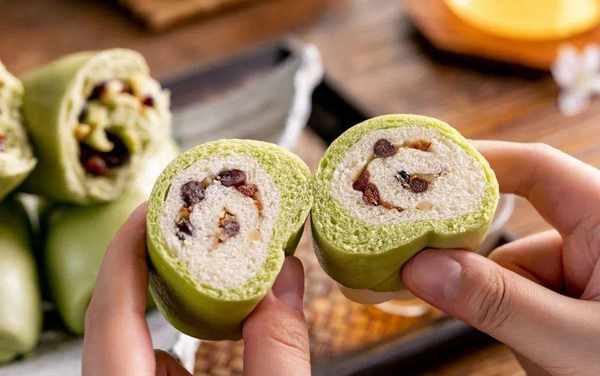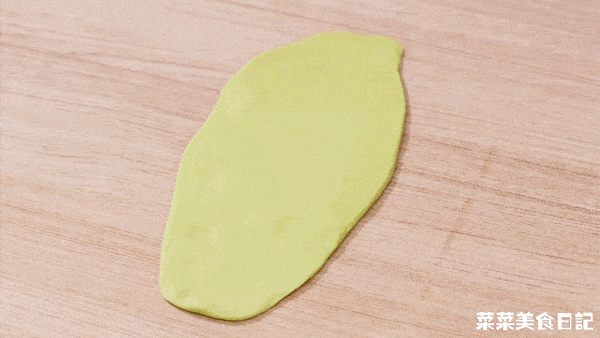 艾草青汁面團搟成長條,疊上自己喜歡的小料,再卷起來就完成瞭。