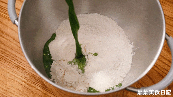 4.揉面缸裡加入400g中筋面粉、混合好的艾草汁、8g食用油,低速攪打成團,再轉高速攪打成團,取出松弛10分鐘