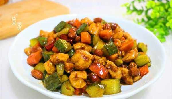 5,倒入胡蘿卜丁和黃瓜丁,大火炒至7分熟,加入1勺生抽、2勺香醋、少許鹽、2勺白糖調味。