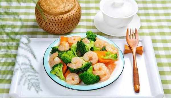 準備所需食材:鮮蝦,西蘭花,胡蘿卜,大蒜,鹽,雞精,料酒,蠔油,蔥薑