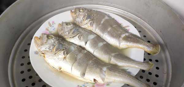 然後,把醃好的黃花魚放入蒸鍋裡,開大火,待蒸鍋上氣後10分鐘即可蒸熟。