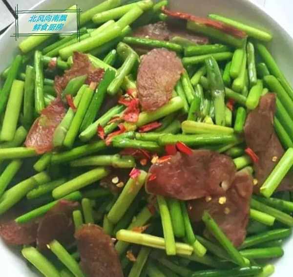 2 另起鍋燒油,下蒜片,幹辣椒爆香,臘腸,蒜苔爆炒,加鹽,雞精,生抽,蠔油各一勺。