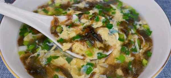 4、鍋中燒水,分兩次倒入水淀粉攪拌一下,把火關掉,把攪好的雞蛋液淋到湯汁裡面,用勺子攪拌均勻,一定要開最小火,這樣蛋花才會非常的漂亮,因為湯汁裡加瞭水淀粉,打出來的蛋花更加的爽滑,趁溫度較高的時候,趕快把雞蛋湯淋到紫菜上,再用筷子攪拌一下,讓裡面的受熱更加均勻,一道非常好吃的紫菜蛋湯就做好瞭。