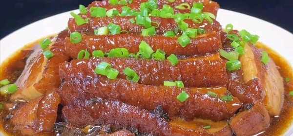 7、然後再放入蒸鍋裡面,扣上蓋子,開大火上汽後蒸一個小時。時間到瞭,把保鮮膜給它取下來,然後在碗上面扣上一個盤子反扣過來,把湯汁倒進鍋裡面燒開,再勾入一勺水淀粉,把湯汁勾至稍微有些濃稠,澆在扣肉上面。再撒上少許的蔥花,一道美味的梅菜扣肉就制作好瞭。