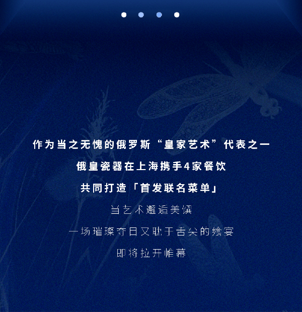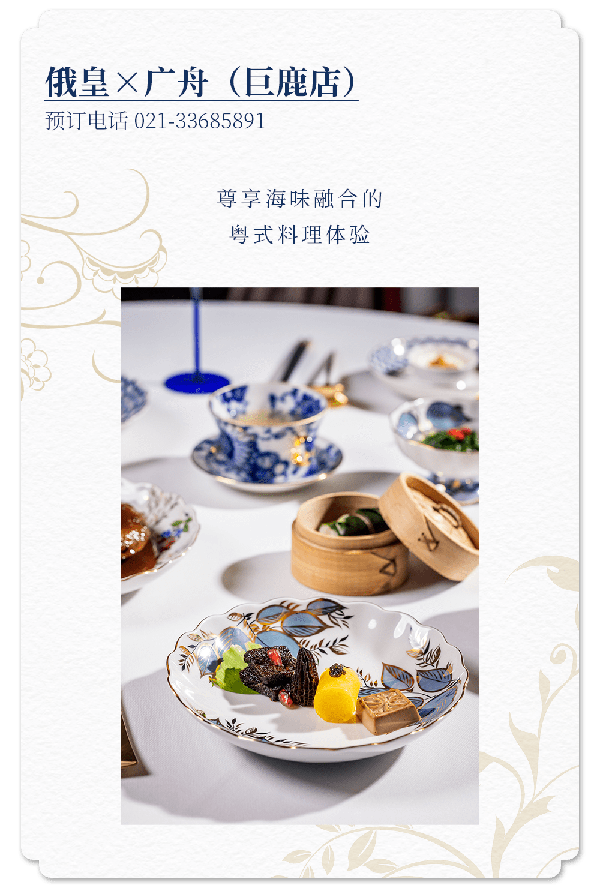 俄皇與廣舟的此次聯袂,將 俄皇鈷藍網紋系列、月光系列、草之祝願系列、莫斯科河畔系列、鳳歌系列、金繕系列中的部分單品與“主廚推薦菜單”融合。將充滿中國味的粵菜與俄式藝術聯結在一起,讓每一位食客都能享受到五感全開的饗宴藝術。
