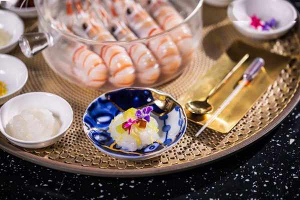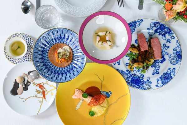 例如 「卡露伽魚子醬三重奏」和 「波士頓龍蝦三重奏」都使用瞭鈷藍網紋系列的瓷器,鈷藍網紋將金色的華美與湛藍色的寧靜完美交融,配合著食材本身的新鮮質感,讓食客們體會這份藝術與味蕾的驚喜碰撞。