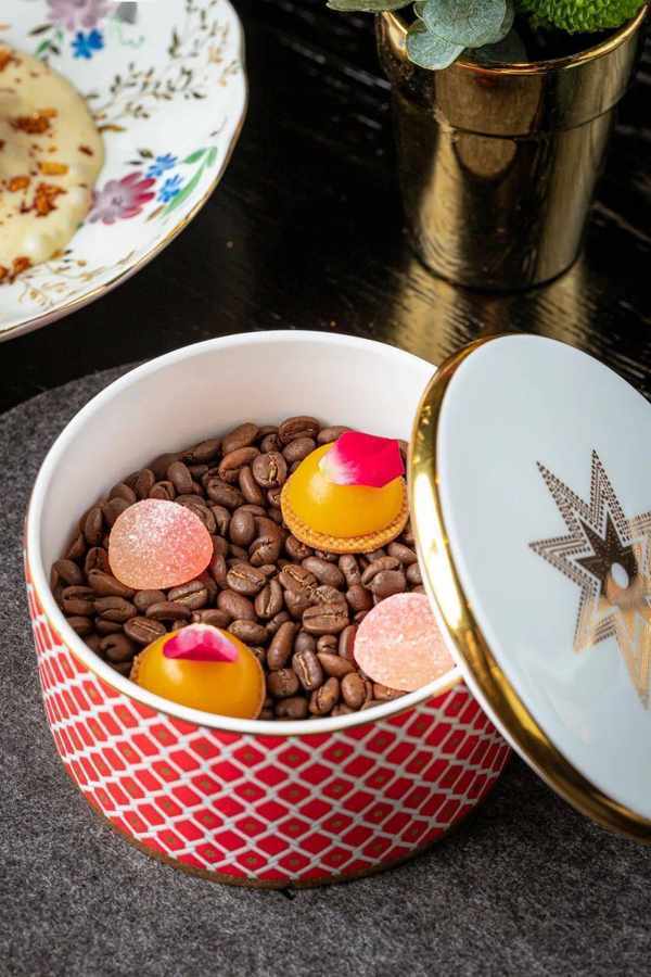 甜點部分 seul&SEUL選擇瞭俄皇STAR系列餅幹盒作為容器,網紋編織交錯,點綴金色小星星,搭配鍍金星星蓋子, 設計現代,簡潔又顯貴族氣質,用來放椰子制作的軟糖和芒果凍這些餐後小點,再合適不過瞭!