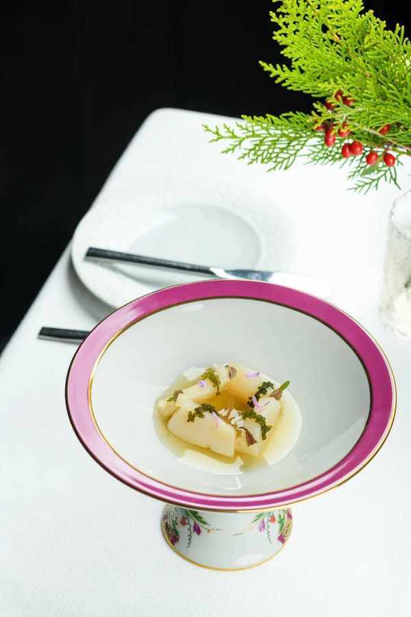 古典華美是 俄皇莫斯科河畔系列的代名詞主廚Reina Chen選擇該系列的高腳盤作為容器,讓盤腳的植物紋理猶如春之神灑下的神跡,粉金交錯的盤沿與菜品中的粉色花瓣交相呼應, 如同春日圓舞曲般靈動美好。