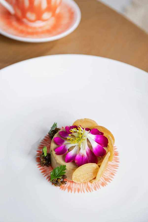 靈感來源於電影《決戰食神》的 「法式焦糖鵝肝醬」融入瞭“分子料理”的理念,不僅保留瞭鵝肝的鮮美,還讓其口感更加絲滑,而 俄皇瓷器上的紅色印花猶如綻放的花朵,將鵝肝、面包薄脆及鱘魚籽醬完美融合,讓這道餐品充滿“春日靈魂”。