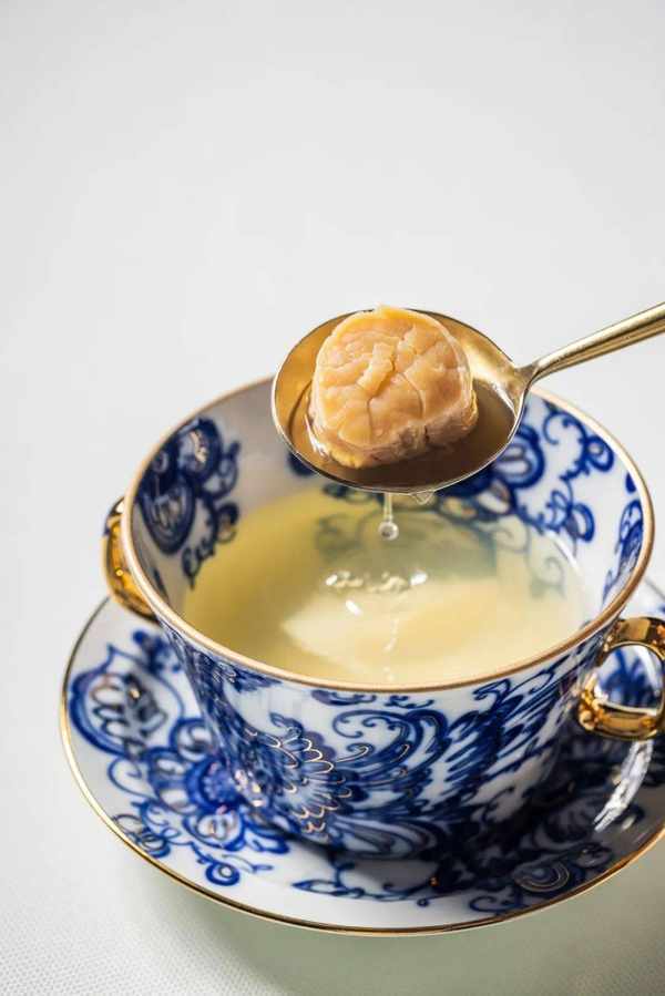 菜單中的湯羹 「宗谷瑤柱燉龍蝦湯」則是與俄皇鳳歌系列雙耳碗組成CP, 一邊是來自海洋的鮮,一邊是來自信仰的“仙”,神鳥鳳凰在湛藍之中翱翔,絲絲金色隨著圖案在器具上流動, 色彩的濃龍蝦湯的濃又形成對仗,不得不為主廚的奇妙創意嘆服。