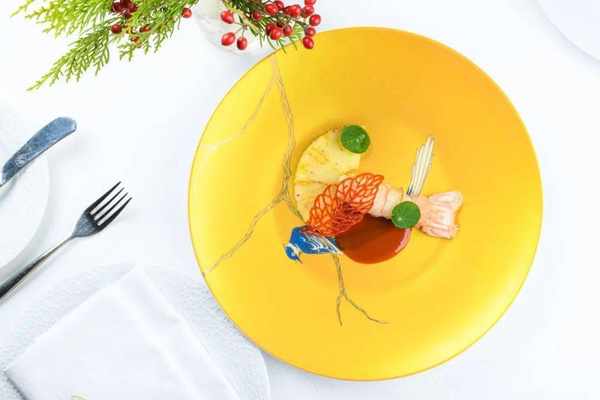 金繕系列作為俄羅斯皇傢瓷器中的“輕奢派”,將鈷藍裝飾的“碎片”通過金色手繪裝飾線連接,將“殘缺”變為藝術,主廚選擇將新西蘭鰲蝦塔塔與其搭配呈現,深邃的鈷藍色將鰲蝦肉襯托得更加晶瑩,繾綣交錯的金線像海中波紋,與蝦肉交相呼應。