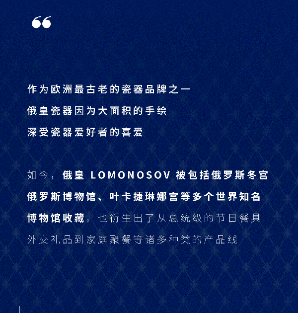 作為俄羅斯皇傢瓷器中的經典ICON,將深邃神秘的鈷藍濃縮成線,交織繾綣成浪漫的花瓣狀網紋,斑駁金色點綴其間,將裝入其中的餐品襯托得更加深邃,更加有經典的厚重感。