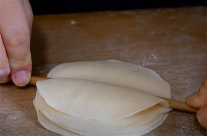 4.把搟好的餅皮都摞在一塊,中間用筷子壓一下。