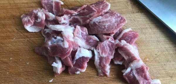 2.五花肉一塊給它切成厚厚的薄片,然後再給它切成小塊,放碗中備用。大蔥一個切蔥花,老薑一塊切成薄片。醃制好的黃瓜用手攥幹水分。