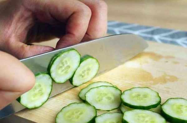 1.首先準備新鮮的黃瓜兩根,放在清水中,給它沖洗幹凈。然後給它切成厚的薄片,最後切成菱形段放入碗中備用。往裡面加入少許的精鹽,用手抓拌均勻醃制兩分鐘。
