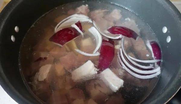 2.牛腩500克切成長條,最後切成小塊,放入碗中。炒鍋內加入適量的冷水,把準備好的牛腩放進去、放入蔥薑去腥。不用蓋蓋子大火燒開。水燒開後轉中火煮沸兩分鐘後撈出。