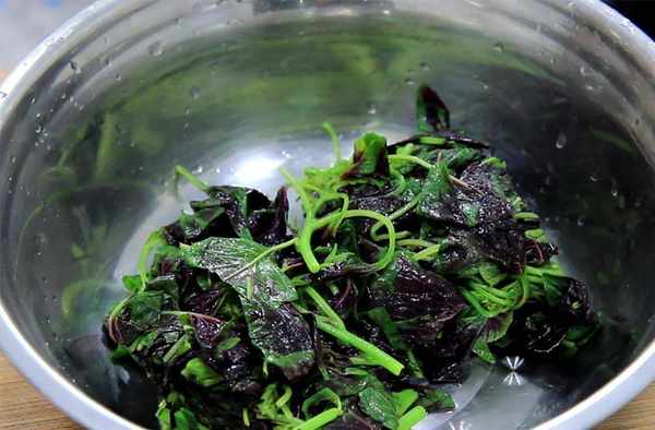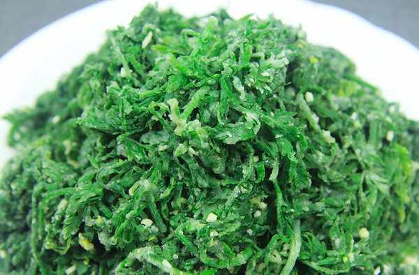 1.準備適量的胡蘿卜纓,隻要嫩葉子,莖桿和老葉都不要,把上面的葉子掐下來放入盆中 ,加入清水淘洗幹凈,放在篦子上面把胡蘿卜纓的水分控幹。也可以用幹凈的細佈把水分擦幹凈。