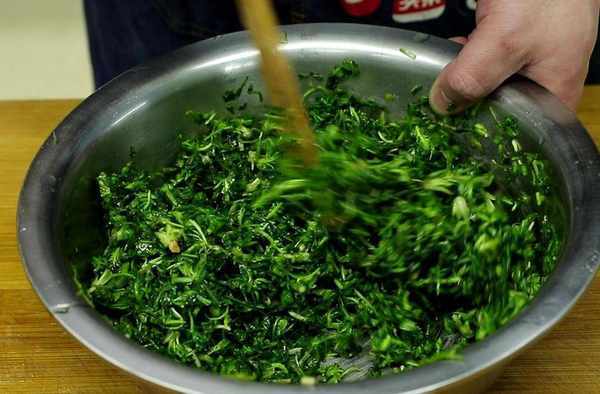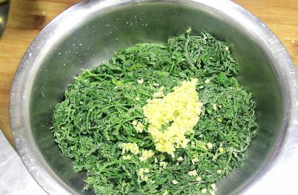 2.準備適量的薺菜,擇洗幹凈後剁碎,加入適量的食鹽醃制一會兒,殺去水分去除土腥味。醃好以後把裡面的水分擠幹凈,加入少許雞粉,淋入一些植物油,裹一層油膜防止在煎的時候出水。