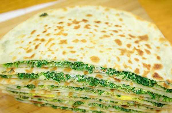 5.電餅鐺燒熱,均勻刷上油,沒有電餅鐺可以用平底鍋,把餅坯放入鍋中,蓋上蓋子,開小火烙2-3分鐘。時間差不多時,打開蓋再刷上一層油,翻過來再烙2分鐘,餅鼓起來時說明菜已經熟瞭,再來回翻幾下即可出鍋,美味即成。
