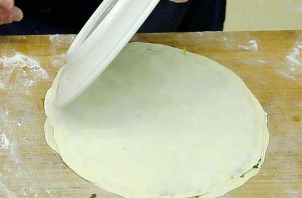 3.案板上撒上面粉,把餳好的面取出來,揉一會兒排排氣,把面團搓成長條,揪成幾個大小一致的面劑子,再搟成中間厚、兩邊薄的面片。搟好以後在上面鋪上一層薺菜,打入一個雞蛋,再用一個面片蓋住,用個圓盤軋一圈防止流汁,照這個方法把剩下的依次做好。