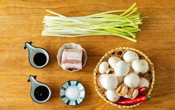 韭黃150g 口蘑200g 五花肉100g 紅尖椒1根 蒜頭2瓣 鹽1小勺