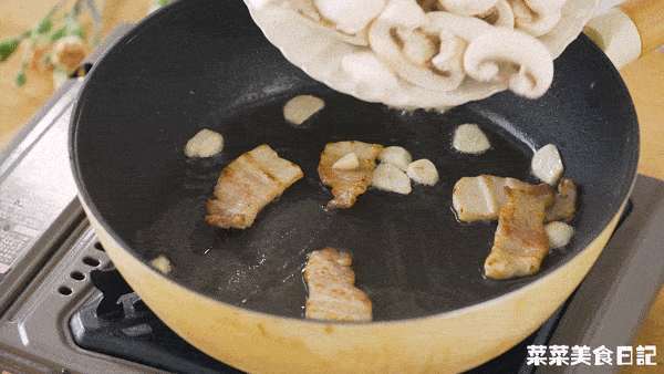 傢裡有豬油的直接擓一勺,也可以學我,切幾片五花肉丟進去煸香。