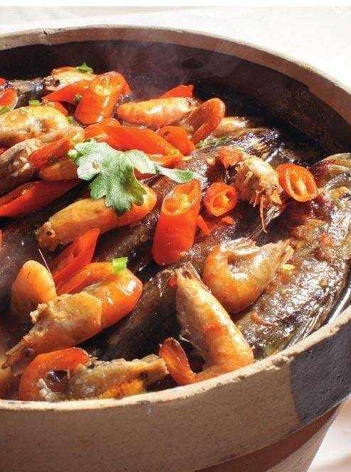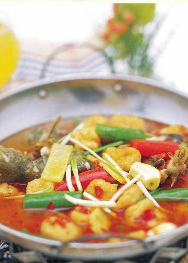 原料:鱖魚仔 4 條(約重 750 克),大河蝦 100 克,鮮紅椒片 100 克。