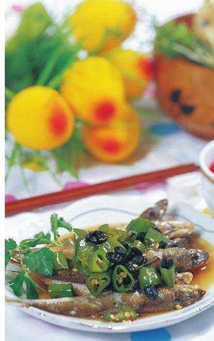 3 將醃好的刁子魚取出,整齊地碼入碗中,醃出的水倒掉,把拌好的青椒、薑末等均勻地撒在刁子魚上,入籠蒸 20 分鐘,熟後取出,淋香油、撒蔥花即可。