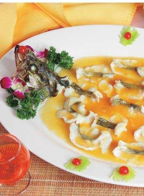 原料:凈鱖魚肉 1000 克,甜酒 250 克,水發香菇 10 克,胡蘿卜、白蘿卜各 20 克,冬瓜 10 克。