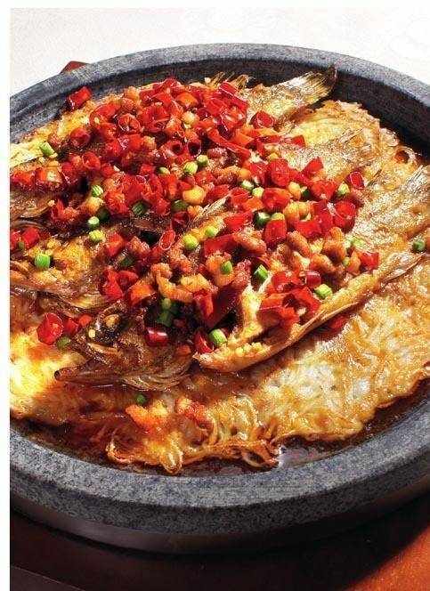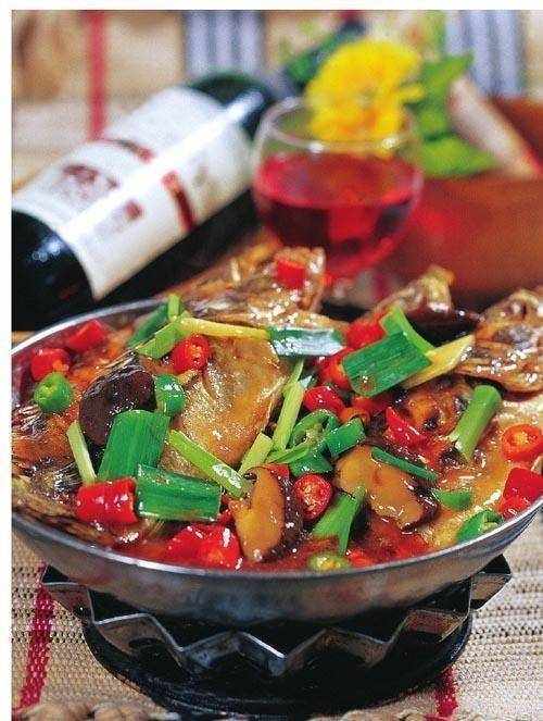 4 鍋內留底油,下薑片、幹椒段、蒜片煸香,將鱖魚整齊地擺放在鍋內,加入鮮湯,調鹽、味精,下陳醋、蒸魚豉油,將魚燒熟,倒入幹鍋中,撒上大蒜葉、紅尖椒圈。帶火上桌。