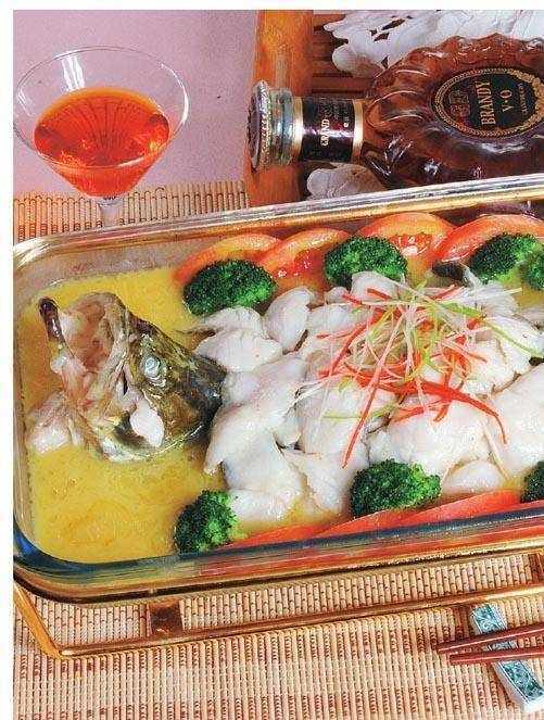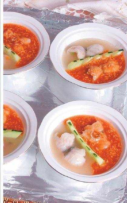 4 鍋內放番茄醬、清水燒開,倒入甜酒,勾水淀粉成稠狀,澆蓋在湯盅一半的魚片上(紅色,甜酸味);鍋內倒入鮮湯燒開,放鹽、味精調味,勾水淀粉成稠狀,澆在湯盅的另一邊(白色,咸鮮味)。