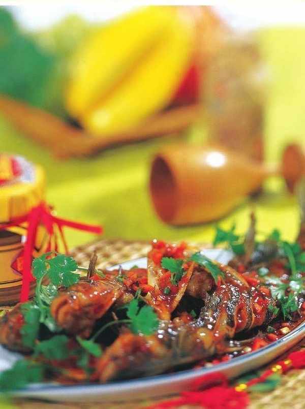 原料:(約 18 厘米長的)黃鴨叫 4 條,黃燈籠辣醬 25 克,紅椒米 1 克,紫蘇末 1 克。