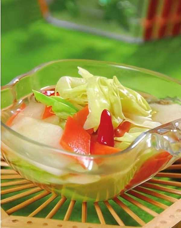 4.蘋果片從鹽水中撈出,浸入辣椒水內,再加入白醋、白糖、鹽,待白糖、鹽溶化後,把圓白菜片、胡蘿卜片浸泡其中,放入冰箱隔夜即可食用。