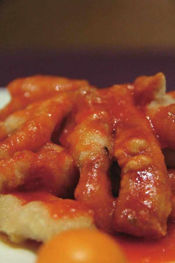 2 將雞蛋、面粉、水淀粉和適量水調勻制成全蛋糊。炒勺放豬油燒至七成熱,將掛好糊的魚條叉分開投入,至呈淺黃色時撈出。取另一炒勺加適量油,將蔥末、薑末煸出香味,加水、白砂糖,待糖溶化後投入魚肉條,燒 3 分鐘,加香醋、精鹽、旺火收濃鹵汁,盛入盤中。