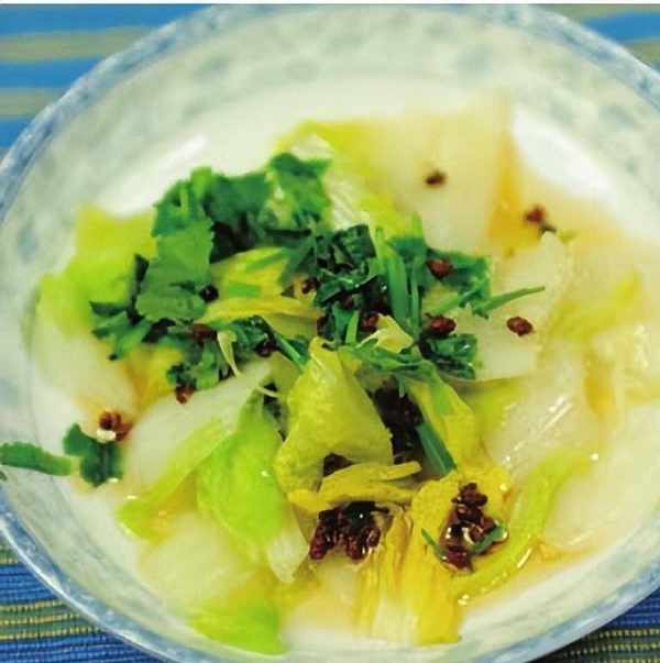 3.用小火炸香花椒,趁熱澆在拌好的白菜上。
