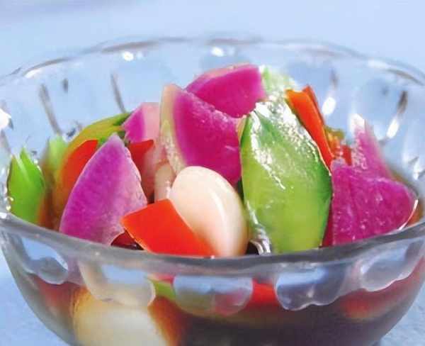 2.將心裡美蘿卜洗凈,去皮切塊後用醋泡 1 小時,撈出後留醋待用。