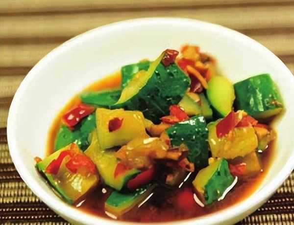 做法:1.將嫩黃瓜用清水洗凈,切去兩頭,對剖用刀拍後切成小塊,放入小盆內,加少量鹽醃幾分鐘,入味後用冷開水洗凈瀝幹。