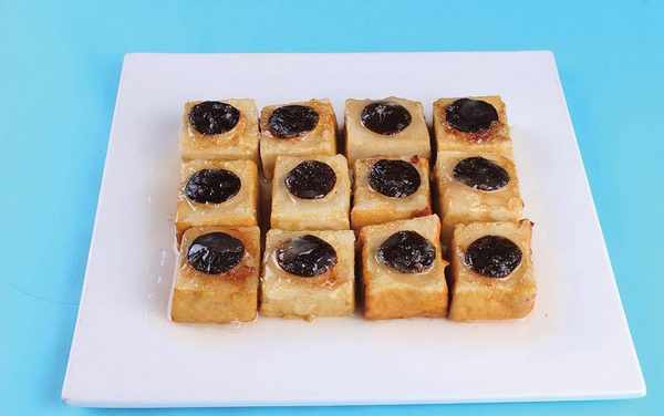 3 炒勺內加油燒至七成熱,將豆腐塊均勻裹上蛋清液投入油鍋,炸至外皮起殼後,潷去油、加清湯、精鹽、燜燒約 5 分鐘,勾芡裝盤即成。
