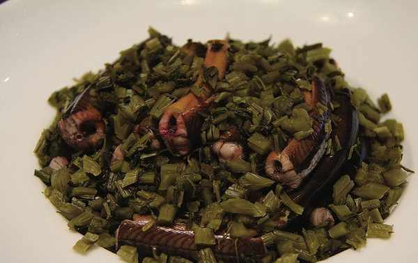 1 燃起木炭火一堆,燃盡後將連堯冬筍埋在火炭中,待筍整體發軟,即已成熟,取出削去根,剝殼後用刀自筍尖部分撬成劈柴塊,放碗中。
