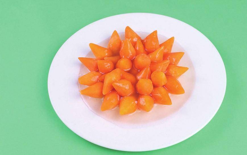 1 將紅芋削皮洗凈,逐個加工成長 2.5 厘米的橄欖形塊。