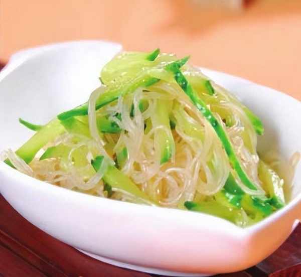 做法:1.將粉絲放入碗內,加入熱水泡發後放入鍋內,加水燒沸,撈起浸入冷開水中冷卻,然後瀝幹水分,切成 10 厘米左右的段放入盆內。