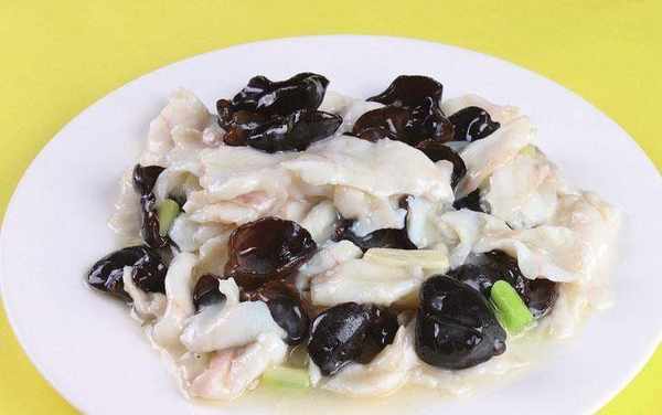 3 炒勺內加底油少許,燒熱後入香槽、蔥薑汁、黃酒、清湯、黑木耳,炒勻後用水淀粉勾米湯芡,倒入冰魚片,淋少許油,裝盤即成。