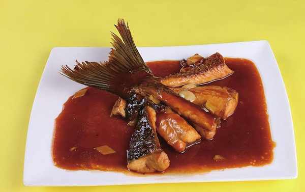3 炒勺內加熟豬油,燒至五成熱時,將魚尾下鍋煎炸,再加醬油、精鹽、白砂糖、黃酒、蔥段、薑末和適量肉湯,燒至入味後,用水淀粉勾芡,淋上香油,撿出蔥段,撒上蔥花,裝盤即成。