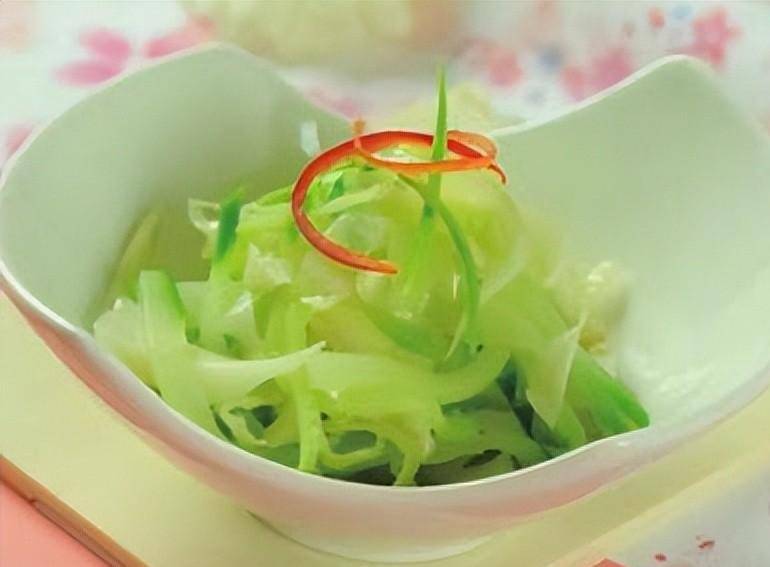 做法:1.將圓白菜洗凈,切成細絲,用開水燙一下,稍涼,瀝幹水;黃瓜洗凈,切成細絲。