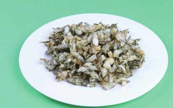 2 炒勺內加香油燒至五成熱,將 3 片茶葉並在一起,沾滿蛋糊,入鍋炸至金黃色時,撈出控油至全部炸好後,排放勺內,撒上花椒鹽,翻勺後再撒一次,晃勻後裝盤即成。
