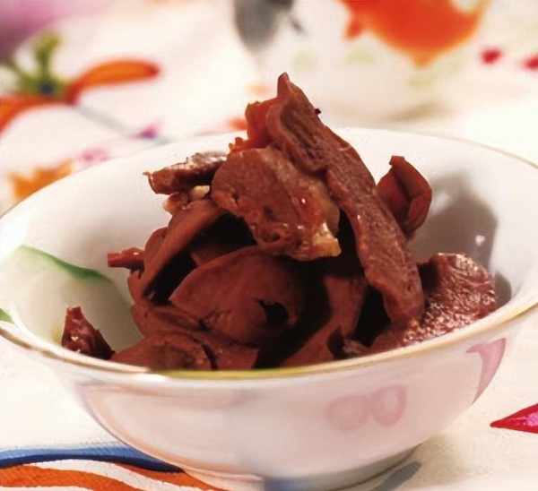 2.將豬心放在鍋內,用文火煮熟撈起,揩凈浮沫。在此鍋內加鹵汁適量,放入鹽、白糖、味精和香油,加熱成濃汁,將其均勻地塗在豬心裡外即成。