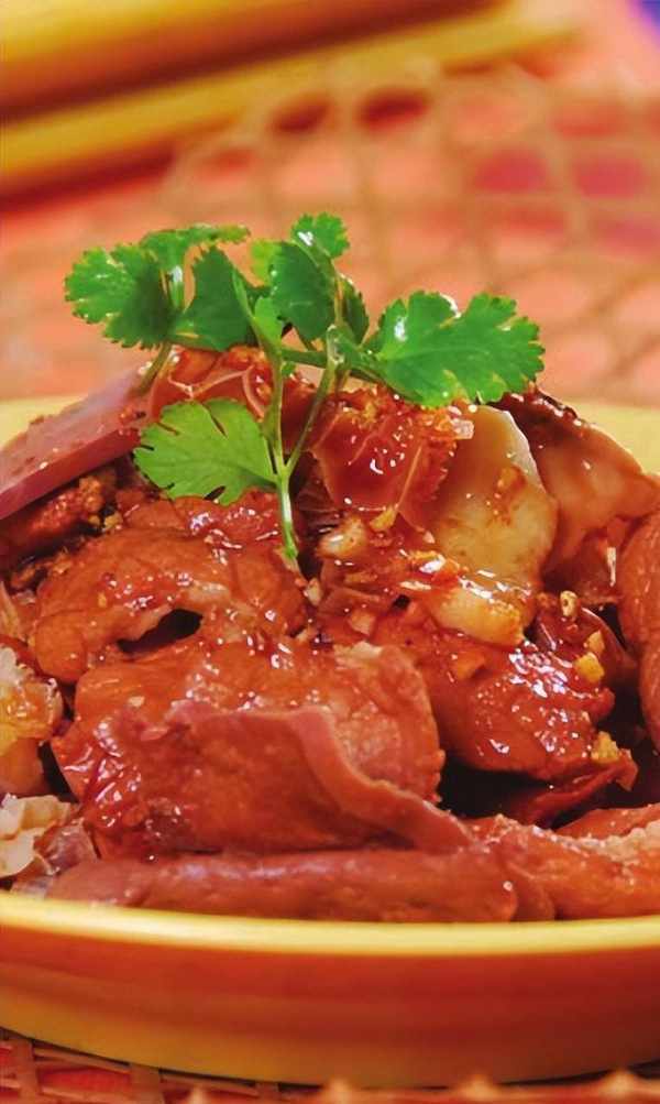 做法:1.將牛肉、牛雜洗凈;牛肉切成重約 250 克的大塊,與牛雜一起放入鍋內,加入清水(以淹過牛肉為度),用旺火燒沸,並不斷撇去浮沫。見肉呈白紅色,潷去湯水,牛肉、牛雜仍放鍋內,倒入老鹵水,放入香料包(將花椒、肉桂、八角用佈包紮好)、白酒和鹽,再加清水 400 毫升左右,旺火燒沸約 30 分鐘後,改用小火繼續燒 1.5 小時,煮至牛肉、牛雜酥而不爛,撈出放涼。